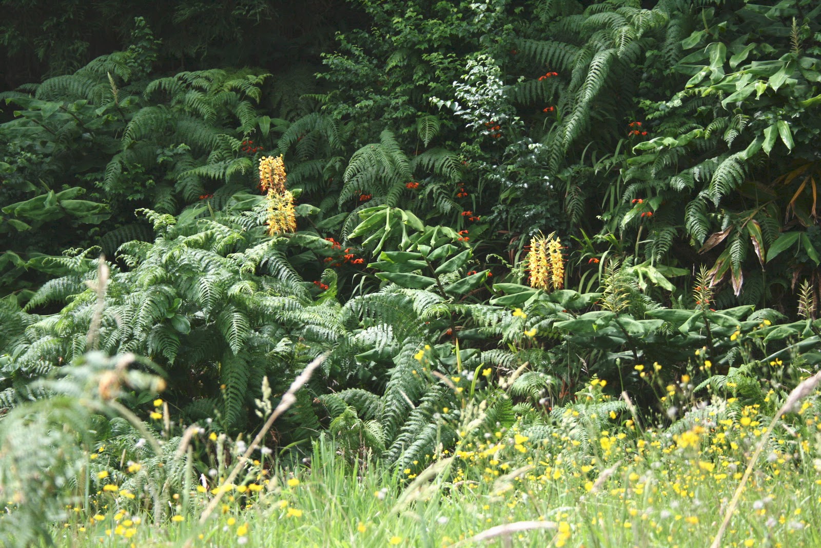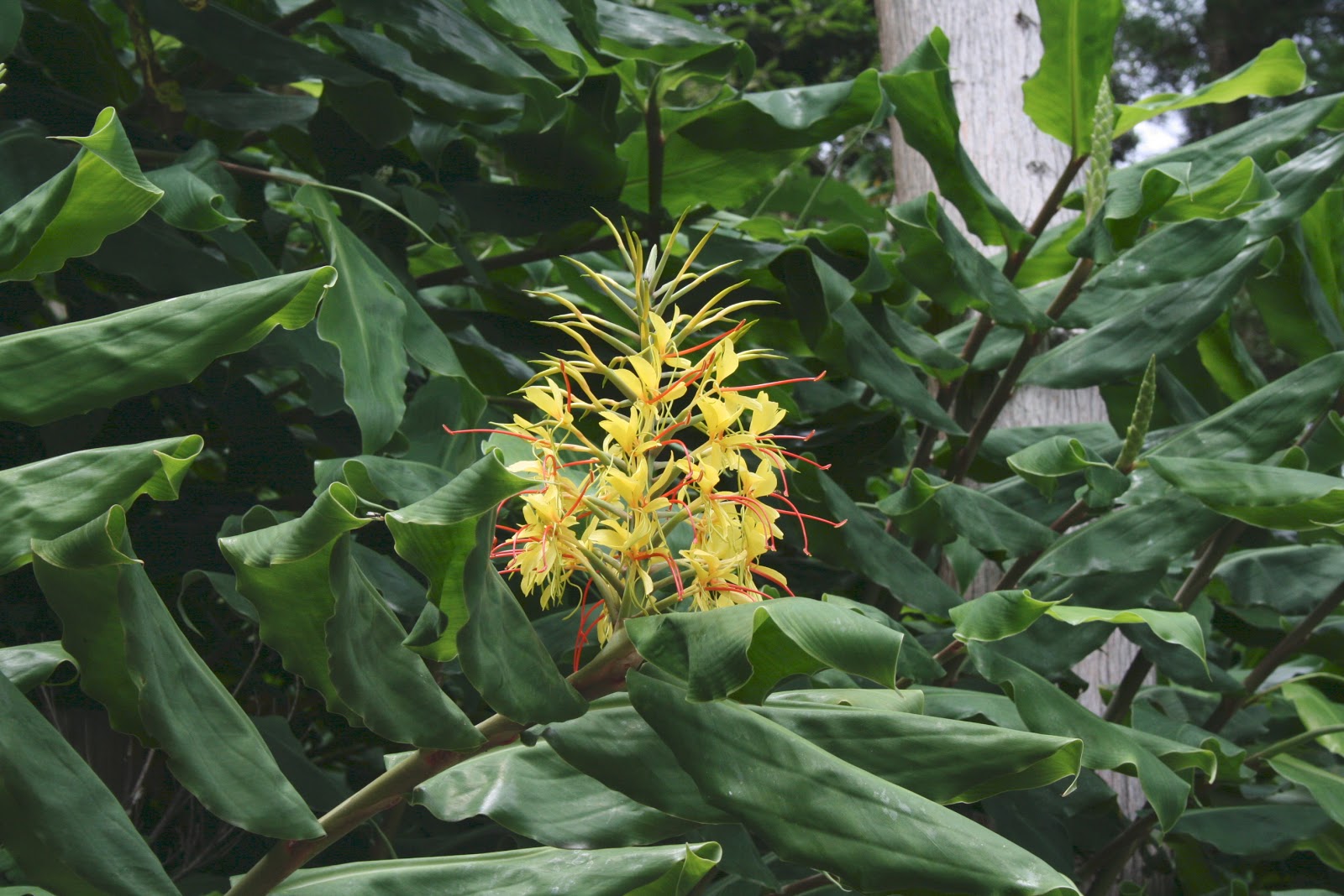 2- Conteira ou Roca-da-velha (Hedychium gardnerianum), provenientes dos Himalaias e também introduzidas no Séc. XIX, disseminam-se facilmente através dos pássaros – talvez, de todas, a que mereça mais atenção quanto à possível ameaça à Laurissilva, na medida que convivem muito bem com altas altitudes;